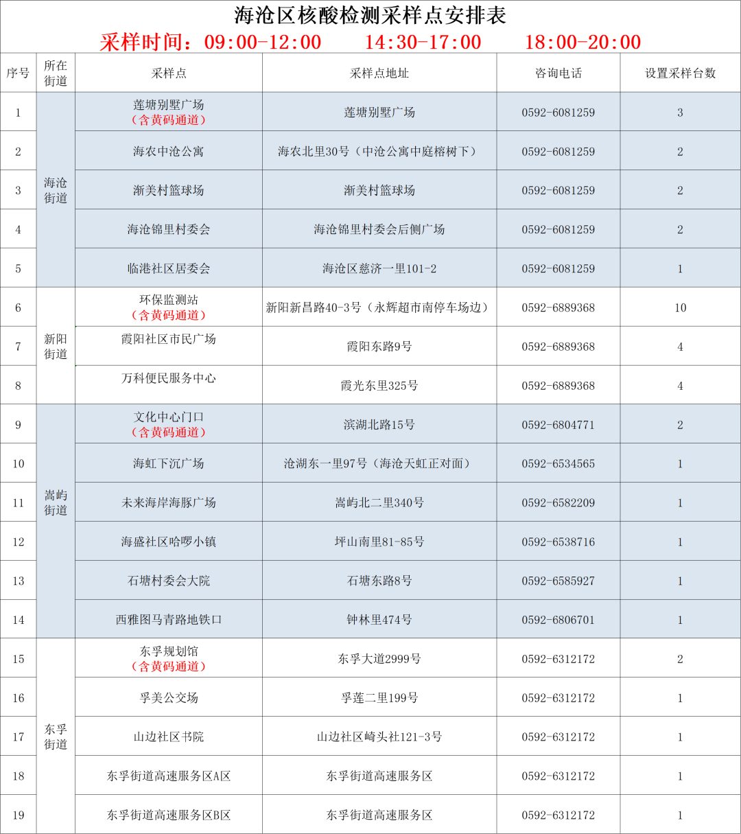 温馨提醒:5月10日,海沧区安排19个便民核酸检测采样点,4个街道均设有黄码人员专用检测通道。采样时间详见下方安排表。
